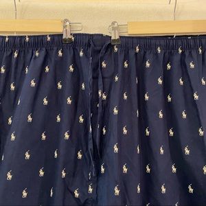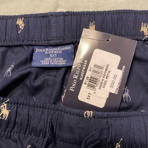 NWT. Size 5XT, 5X Tall. Polo Ralph Lauren big and tall pajama sleepwear pants. Navy blue with cream Polo logo allover. Elastic waist with drawstring. Slash side seam pockets. Button closure on center of fly. 100% cotton. Measurements (flat & approximate): waist 27-35", hip 34.5", rise 19", inseam 34", ankle opening 11.5". Machine wash. No trades, please!