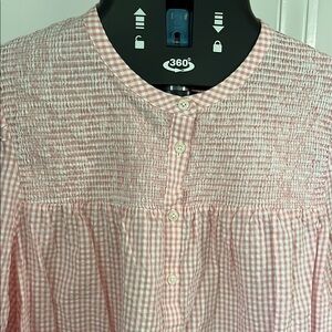 This charming blouse showcases a delightful pink and white color palette, complemented by puff sleeves and a seersucker fabric. Its swingy, relaxed fit ensures comfort and style, making it a versatile addition to any wardrobe.