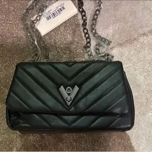 This luxurious Valentino crossbody bag features a striking quilted chevron pattern in classic black leather. The structured design is complemented by a chic chain strap and a signature 'V' embellishment, making it a sophisticated choice for any occasion.