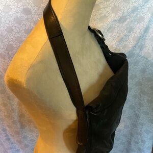 This Lucky Brand shoulder bag in classic black offers a structured design that is both stylish and practical. Crafted from a leather-like material, it features a minimalist aesthetic with a medium size perfect for everyday use. The bag's sleek black straps and rounded bottom shape add to its timeless appeal.
