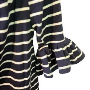 Stylish off-shoulder top with navy and white stripes. Features ruffled sleeves and bows on straps for a chic look.