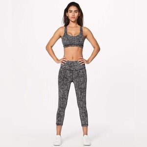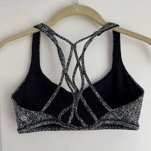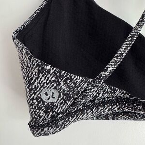 Lululemon bra, Free to Be Serene, Power Luxtreme bra, strappy sports bra, Lululemon size 6, yoga bra, light support bra, black and white Lululemon, criss-cross back, removable cups, denim twill print, athleisure wear, workout bra, serene bra Lululemon