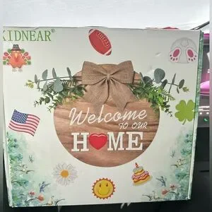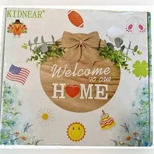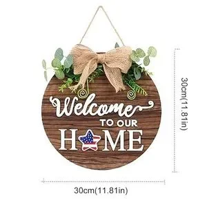 Charming wooden welcome sign with a decorative bow and greenery. Perfect for home decor.