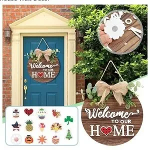 Interchangeable Welcome Sign Front Door, Seasonal Welcome Round Fall Wood Wreath