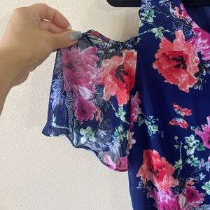 Beautiful Blue R & K Dress , pink floral design , Ruffle detail at hem , cold shoulder short ruffle sleeves
