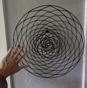 Intricate dark metal wall art sculpture. Perfect for modern decor. hangs on the wall but can also double as a shallow basket for a table top. rustic wire construction that looks like a net that's morphing into a rosette.