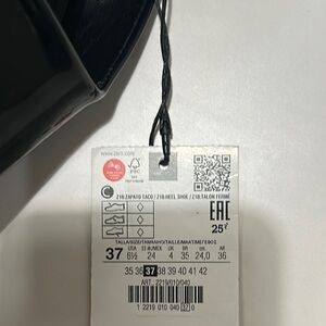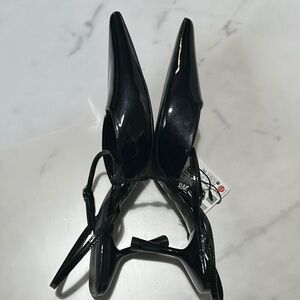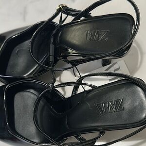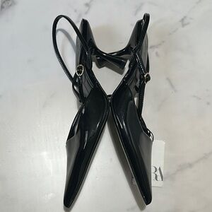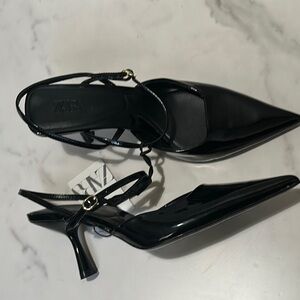 These sleek Zara heels feature a glossy black patent leather finish and a classic pointed toe design. The medium-high stiletto heel adds a touch of elegance, making them perfect for formal occasions. With their minimalist silhouette, these shoes offer a timeless and sophisticated look.
