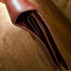 Elegant burgundy leather clutch with gold corner accents. Features a wrist strap for easy carrying.