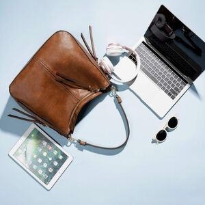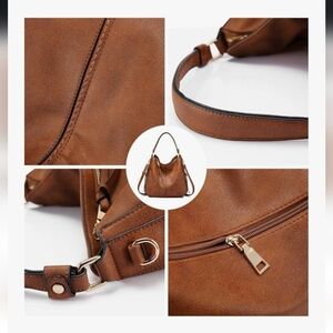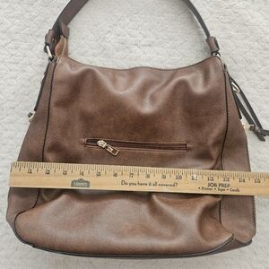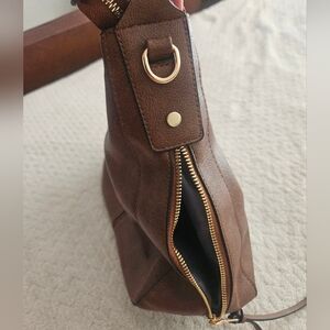 Elegant brown faux leather hobo bag perfect for everyday use. Features a spacious interior and a comfortable shoulder strap. Ideal for adding a touch of sophistication to any outfit. Like new.