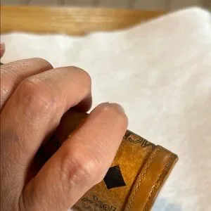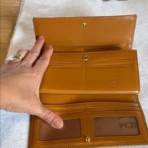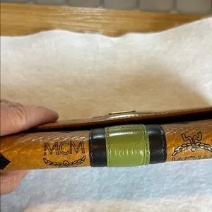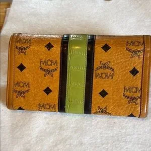 Elegant MCM wallet with signature logo pattern. Features brown and green accents.