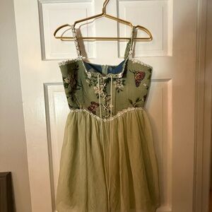 Charming green dress with floral and butterfly design. Features lace-up front and delicate lace trim. Perfect for a whimsical look.