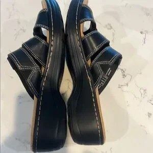 Elegant black leather slides with decorative stitching. Ideal for everyday comfort.pre-owned in excellent conduit. Light weight and comfortable. Make an offer!