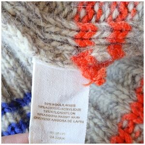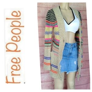 New no Tags Embrace the cozy charm of the Free People Beige Geometric Cardigan, a perfect blend of traditional and modern style. This cardigan features a cream base with vibrant geometric patterns in pink, orange, and navy blue, adding a pop of color to your wardrobe. The V-neck design and long sleeves make it an ideal layering piece for any casual occasion. Crafted with attention to detail, this sweater showcases a Fair Isle-inspired pattern that elevates its classic appeal.