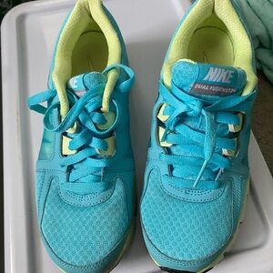 Bright teal sneakers with lime accents. Comfortable and stylish for active kids. Durable design for everyday wear.