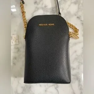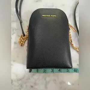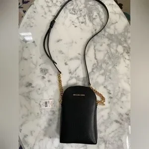 Chic black leather crossbody with gold chain strap. Features Michael Kors logo in gold.