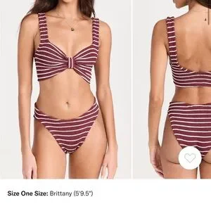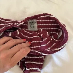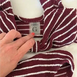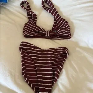 Stylish and comfortable, this striped burgundy bikini set is perfect for beach days. Enjoy a flattering fit with a chic design. One size fits all. Smoke free home