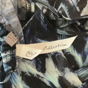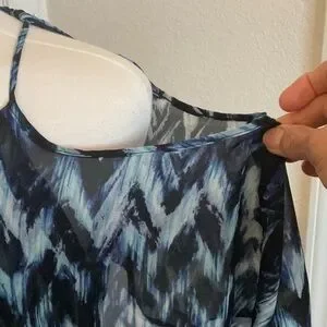 This casual sundress from NY Collection features a striking blue and white chevron pattern, perfect for a relaxed day out. The dress boasts a cold shoulder neckline with spaghetti straps and flutter sleeves, adding a playful touch to its maxi length. Crafted from lightweight fabric, it offers a comfortable fit with a fitted bodice that flows into a relaxed skirt.