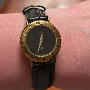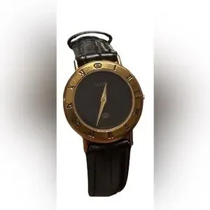 Classic and refined, this Gucci timepiece is a perfect balance of vintage sophistication and understated luxury. With its minimalist black and gold palette, Roman numeral markers, and slim profile, it’s a versatile accessory suited for both everyday wear and formal occasions. Ideal for collectors of vintage Swiss watches, lovers of Italian fashion, or anyone seeking a timeless statement piece. Think quiet luxury, retro elegance, and heritage design.