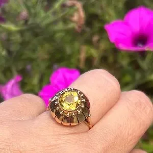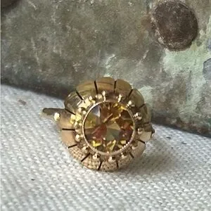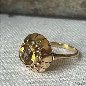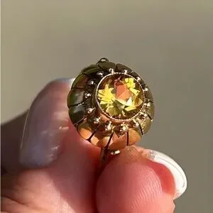 Very Vintage and solid gold showcasing one very large natural hand cut Citrine. Old cut with a high crown this Citrine shoots golden fire while complimenting the yellow gold. Gorgeous statement piece crafted into a flower with a halo of petals all around the center. Looks like a sunflower to me. Stunning.