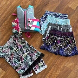 Vibrant kids' clothing set with a mix of patterns and colors. Life vest has mild discoloration