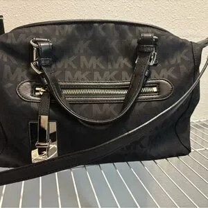Stylish black satchel by MICHAEL Michael Kors. Features signature MK pattern. Silver-tone hardware accents. Perfect for everyday use.