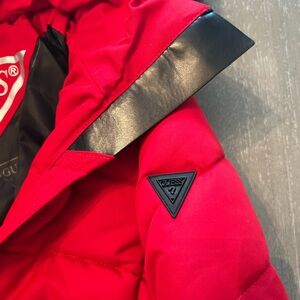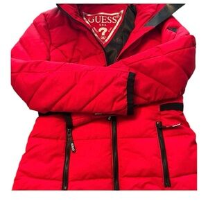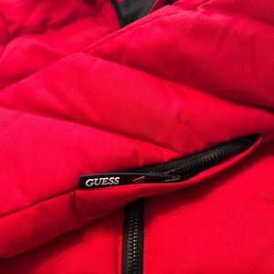 Bold red quilted jacket by GUESS. Features sleek black details and zippers. Ideal for chilly days.