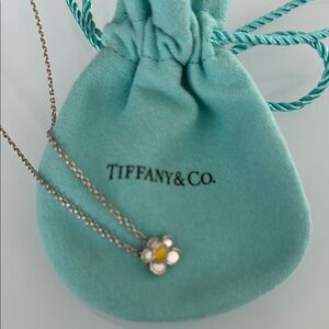 This lovely Tiffany & Co necklace features a delicate silver cable chain with a polished finish, and a small “daisy” made from sterling and enamel offering a timeless elegance. The secure clasp ensures a comfortable fit, making it a versatile addition to any jewelry collection.