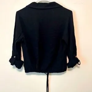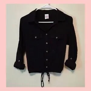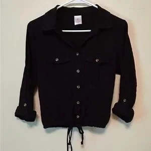 Eco-friendly black shirt made from recycled polyester. Simple and versatile design. Button up shirt with a tie at the bottom. In good used condition.
