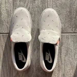 Nike slip-on shoes in white with black swoosh accents. Comfortable and stylish for everyday wear.