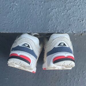 New Balance 2002R sneaker in a cream colorway with pops of indigo, red and black. Has the classic netting with suede upper. In great condition & ready for a new home!