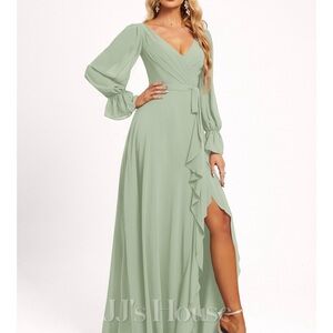 Chic long sleeve dress by JJs House. Light green (celadon) with a wrap style. Perfect for elegant occasions. New, never worn.