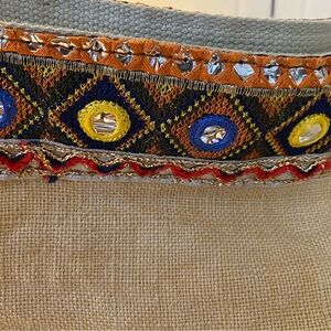 This boho style shoulder bag features intricate floral embroidery, leather accents on a beige woven canvas fabric. Pretty bordered embellished ribbon accent. Inside zippered pocket and double inside pocket. Can be worn with or without canvas strap. Top zips completely closed. Fun addition to any outfit.