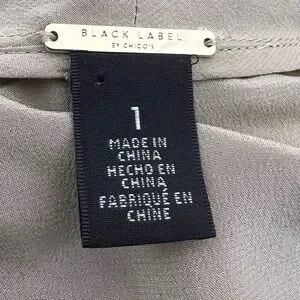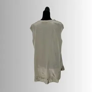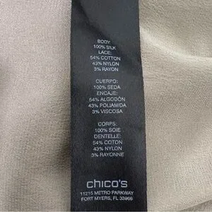 Chico’s 100% Silk, Black Label Champagne Top, Short Laced Sleeves, Size 1/Medium. There is a barely there sleeve with lace and a matching lace under hem. Lace constructed of cotton, nylon and rayon while the blouse itself is 100% silk. Sustainable quiet luxury silk soft workwear office wear casual pair with jeans or blazer and skirt