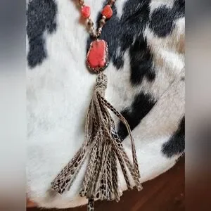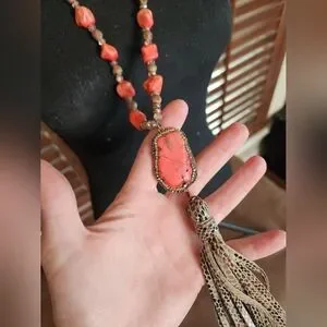 This stunning handcrafted necklace features vibrant red and earthy brown stones, perfect for adding a pop of color to any outfit. The intricate design and unique tassel detail make it a standout piece in any jewelry collection.