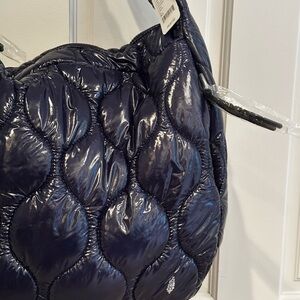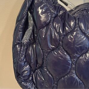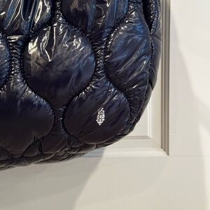 Just as effortless as it is essential, this so cool carryall bag is featured in an oversized style and quilted shiny fabrication to add an added special touch.