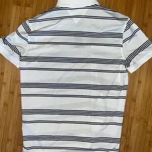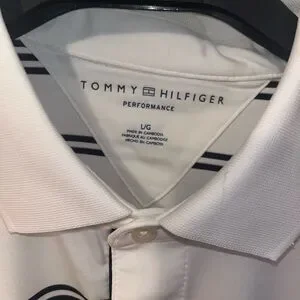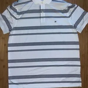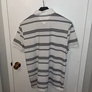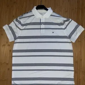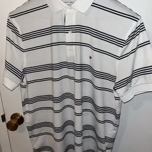 Experience timeless style with the Tommy Hilfiger Polo Shirt, featuring a crisp white base accented by sleek black stripes. This classic polo is crafted from a comfortable knit fabric, making it perfect for both casual and smart-casual occasions. The iconic Tommy Hilfiger logo adds a touch of sophistication to this versatile wardrobe staple. Mint condition.
