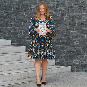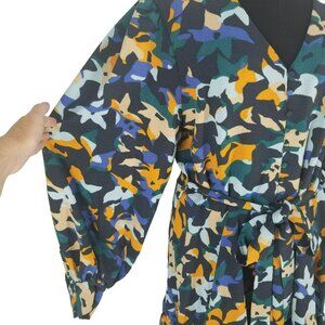 Vibrant dress with abstract pattern. Features long sleeves and a ruffled hem. Perfect for a bold look.