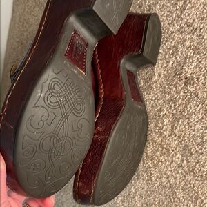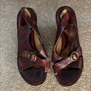 Elevate your style with these Born platform shoes, featuring a rich brown leather upper and a chunky wooden heel. The slip-on design with ornamental hardware adds a touch of sophistication, making them perfect for any occasion. 3 inch heel. Good Preowned Condition. Some scuffs and minor flaw - see photos for details. Sizing from manufacturer. Not responsible for actual fit. Smoke free home. Reasonable offers welcome. Thanks for checking out my closet!