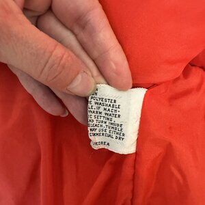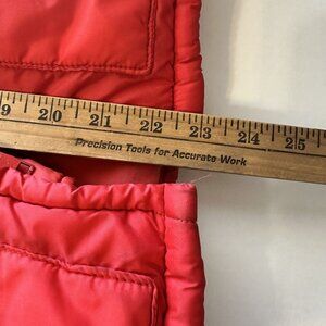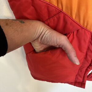 A bold retro puffer vest with vibrant chevron colorblocking in red, orange, and yellow. Insulated design offers warmth and vintage charm. Nice sized pockets and great color. Good condition outside of stains. Kids 18. Adult Small. Unisex.