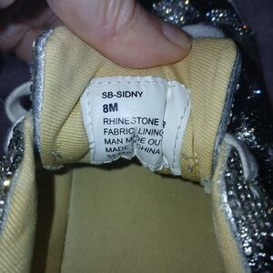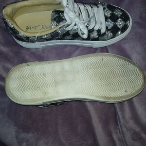 Dazzling sneakers with a checkered glitter design. Features black and silver pattern. White laces add a classic touch.