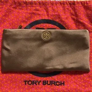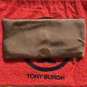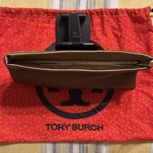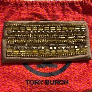 Chic Tory Burch clutch with metallic gold accents. Rich brown base enhances elegance. Ideal for evening wear.
