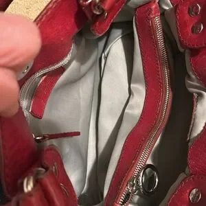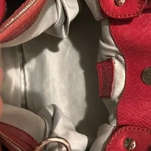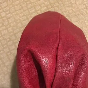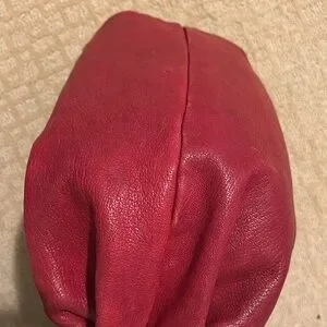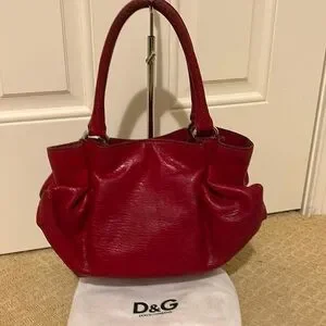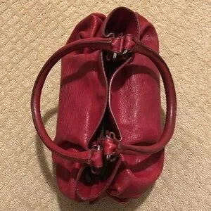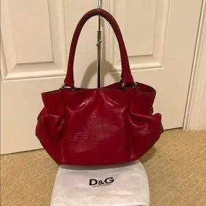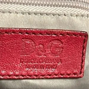Elevate your style with this stunning dark red leather bag from Dolce & Gabbana. Perfect for any occasion, this bag combines elegance and functionality. Pleating at front, back and sides. Leather has minimal wear but handles have some darkening. Pleating on one side is slightly looser than other side but is not readily noticeable. Interior is clean. Includes mirror compact and dustbag.