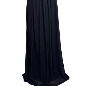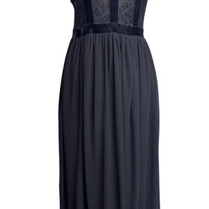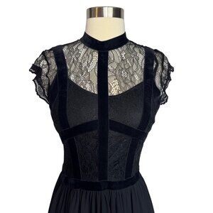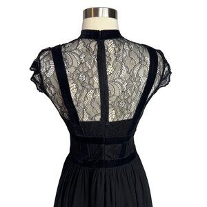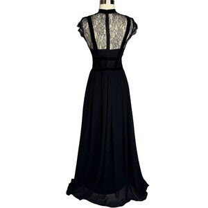 This elegant black maxi dress features a lace bodice, velvet detailing, and a flowy skirt. Ideal for formal events or evening wear.