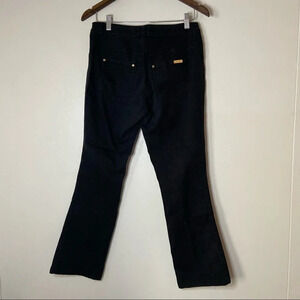 • black denim pull on jeans, no zip. Cotton / polyester blend. Metal brand tag detail on back pocket.