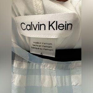 New with tags! Sweet and breezy Calvin Klein women’s sleeveless dress in a soft blue and white gingham texture. Features a tiered skirt, sheer panel neckline, waist tie, and hidden back zip closure. Fully lined. This dress is perfect for warm weather brunches, garden parties, or casual weekends.