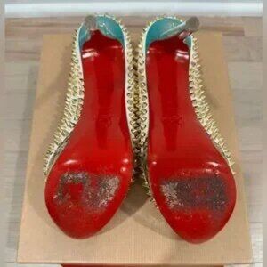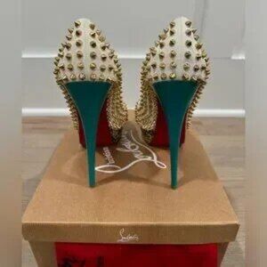Authentic Christian Louboutin lady peep multi color size 42. They feature spike embellishments with peep toes and a colorful exterior. Completed with leather insoles, stiletto heels, and the signature red soles. Excellent condition gently worn. Comes withth box, dust bag, and extra heel taps.