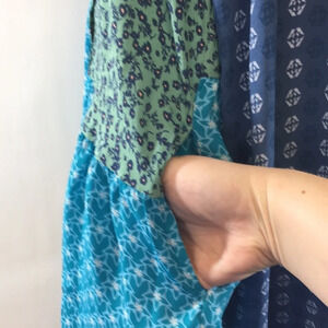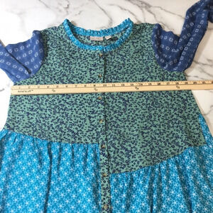 Logo Lori Goldstein Blue Floral Patchwork Grechen Tunic Shirt Womens XS. Long Sleeve. Button front closure. Bright blue/green mixed floral print. Ruffled hem. Loose, flowy fit. Side pockets. 100% Polyester Pre-owned Condition- no flaws, no rips, stains, or holes.