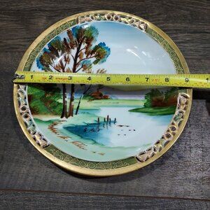 Occupied Japan UCACGO reticulated 9 1/4 " diameter plate has a farmhouse cabin landscape scene. It is handpainted with a gold edge. Signed by the artist set of 2 vintage porcelain pieces from the 1940 are decorative and unique addition to any setting. The plates have a semi gloss finish and are of Asian style. Made in Ucagco, Japan, these one-of-a-kind plates are timeless