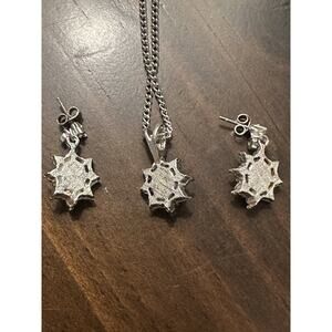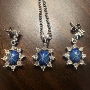 VTG 1970 Faux Blue Star Sapphire Rhinestone 18" Silver Tone Necklace & Earrings
