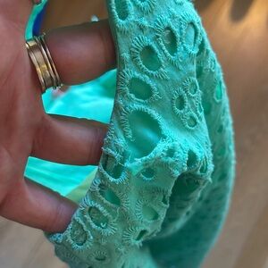 Beautiful Lilly top with mint green color in an eyelet pattern! In good condition - small defect in R armhole in eyelet as pictured in last photo.